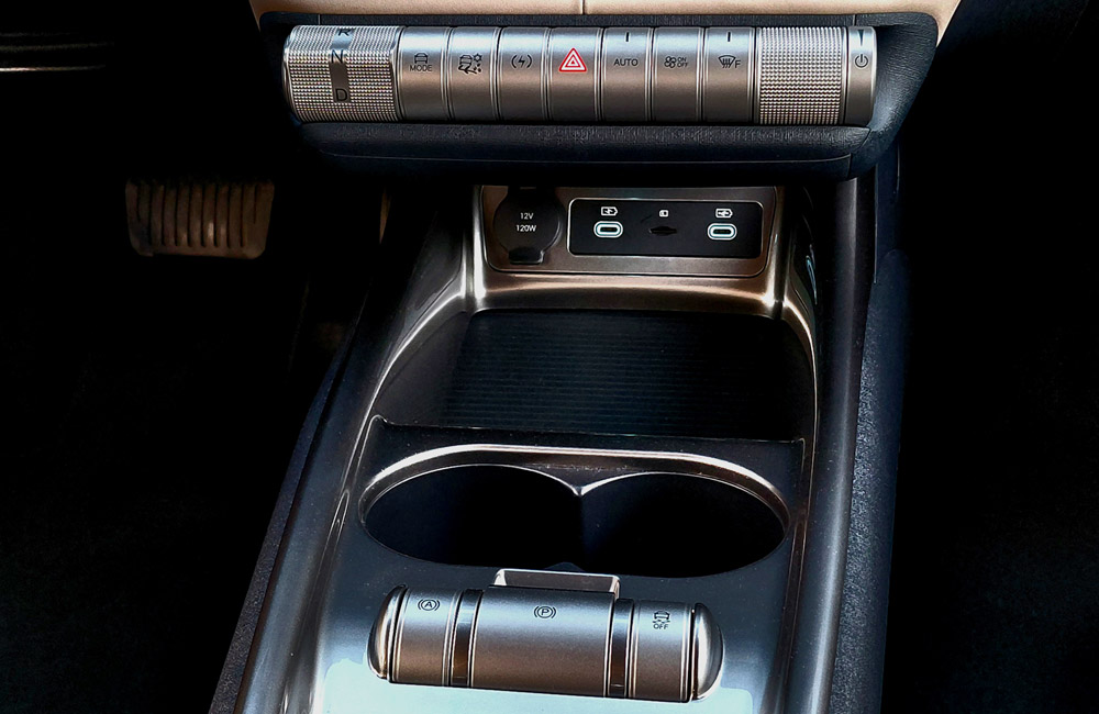 Pessoalmente gostei da secção central com os controlos principais, que coloca do lado do condutor os controlos da transmissão (R, N, D), os modos de condução Eco, Normal e Sport, e a força de travagem (Normal ou High). Do lado direito desta secção cromada cilíndrica pode configurar o volume do rádio, caso não queira recorrer aos comandos no volante e no ecrã central.