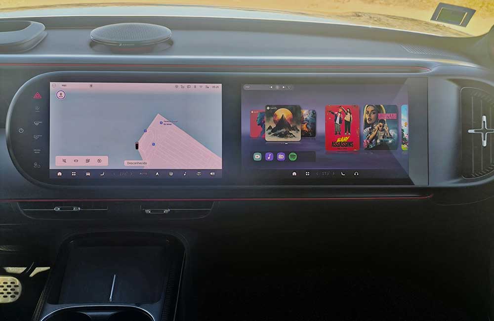 A novidade maior em comparação ao teste ao Smart #1 foi a presença do ecrã do lado direito, em frente ao passageiro da dianteira. Ele é um centro de entretenimento que serve para ver filmes, usar aplicações e até fazer jogos de consola.