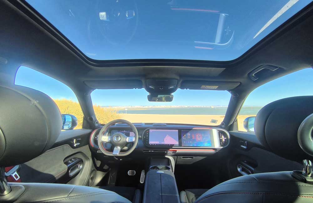 Obviamente parei para explorar ao limite o Smart OS. O que me permitiu descobrir, por exemplo, os vários modos oferecidos. O que mais me chamou à atenção foi o modo Campismo, que rebate todos os bancos e transforma o carro numa “mini-autocaravana”. Ele permite, com um simples colchão para nivelar a altura, aproveitar o muito espaço no Smart #5 Brabus para dormir ao ar livre e, com o teto panorâmico, desfrutar do céu estrelado em locais mais recônditos.